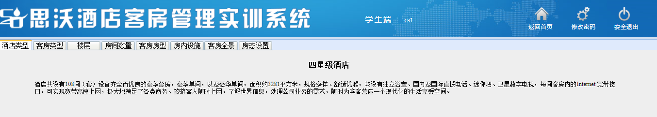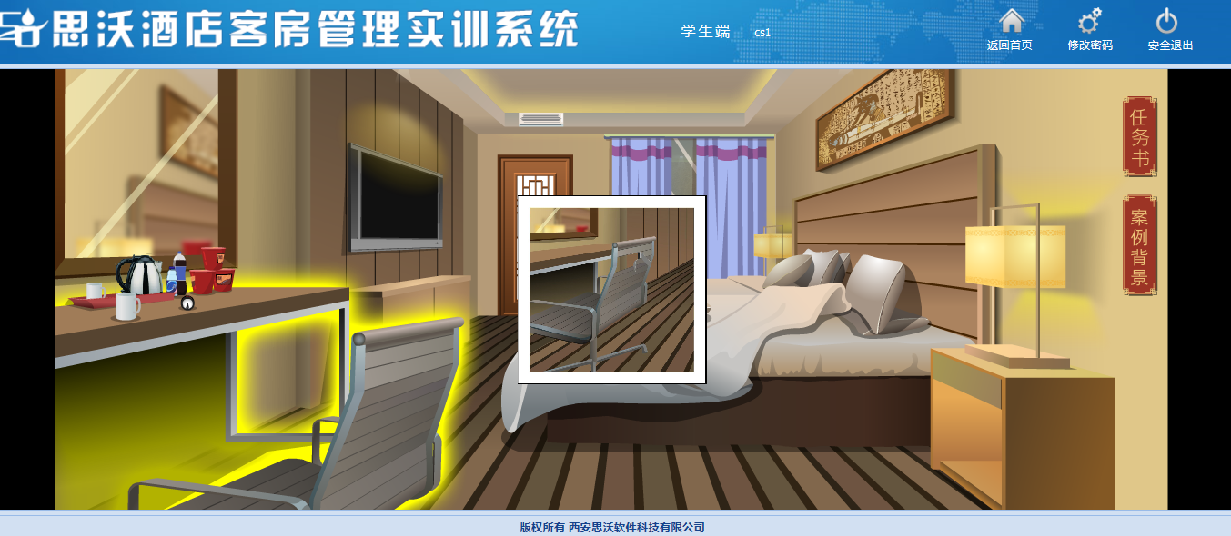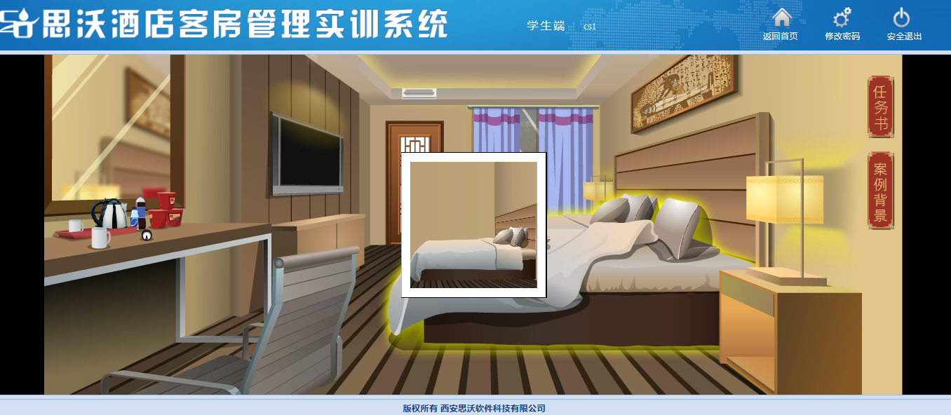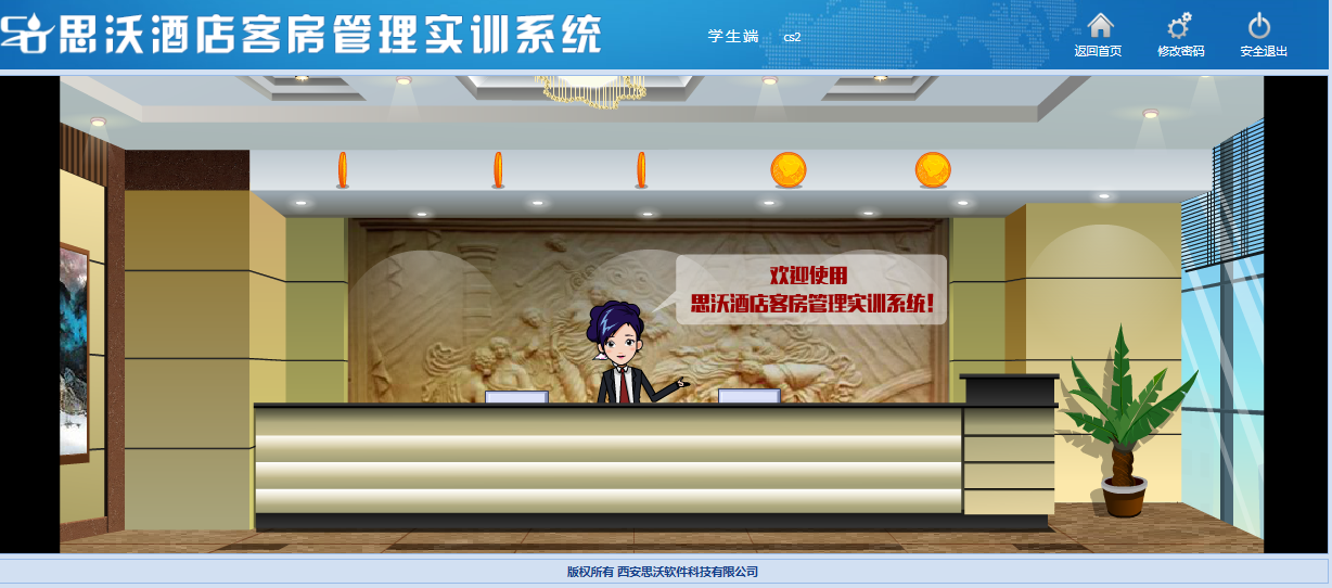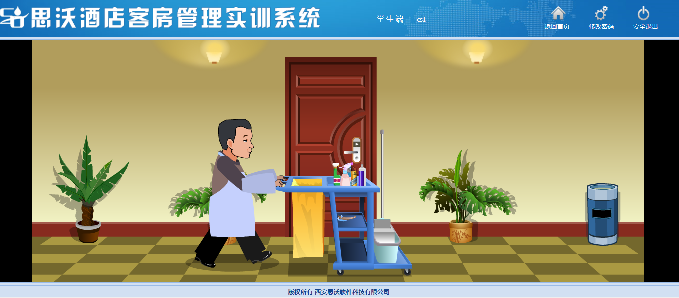 思(si)沃酒店(dian)客(ke)房管理(li)模擬實訓系(xi)統以flash動(dong)畫模擬酒店(dian)情景(jing),學生進入進行模擬客(ke)房管理(li)日常(chang)事務處(chu)理(li),包括(kuo)客(ke)房設(she)計、引領入住、客(ke)房查房、客(ke)房整理(li)、布草(cao)間(jian)等類型實訓。