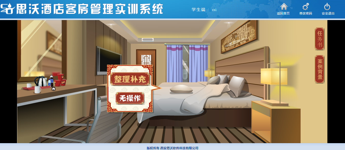 該(gai)教學(xue)軟(ruan)件平臺模(mo)擬客(ke)房(fang)場景,學(xue)生通(tong)過場景互動進(jin)行(xing)模(mo)擬操作,包含任務書、案例背(bei)景等,學(xue)生在操作過程中可隨時查看進(jin)度。學(xue)生通(tong)過該(gai)教學(xue)軟(ruan)件平臺的(de)虛擬場景中可對床上用品、窗簾、電器、桌椅、茶幾上的(de)消費商品、洗漱臺、馬桶、浴室等進(jin)行(xing)整理(li)操作。