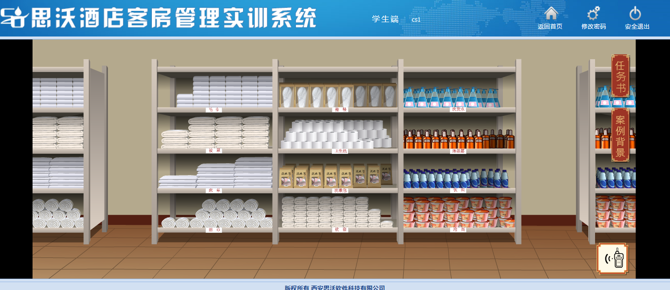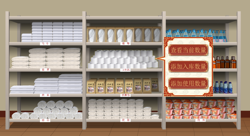 學生端包含布草間管理(li)(li)場景模(mo)擬(ni),學生模(mo)擬(ni)工作人員通過動畫場景互動對布草間進(jin)行管理(li)(li)操(cao)作。并可查看床單、被罩、枕套、浴巾(jin)、毛巾(jin)、洗(xi)漱包、洗(xi)發水等消耗物品的庫(ku)存數量(liang),并判斷是否(fou)補(bu)充(chong)。