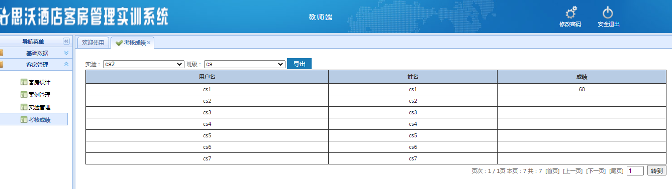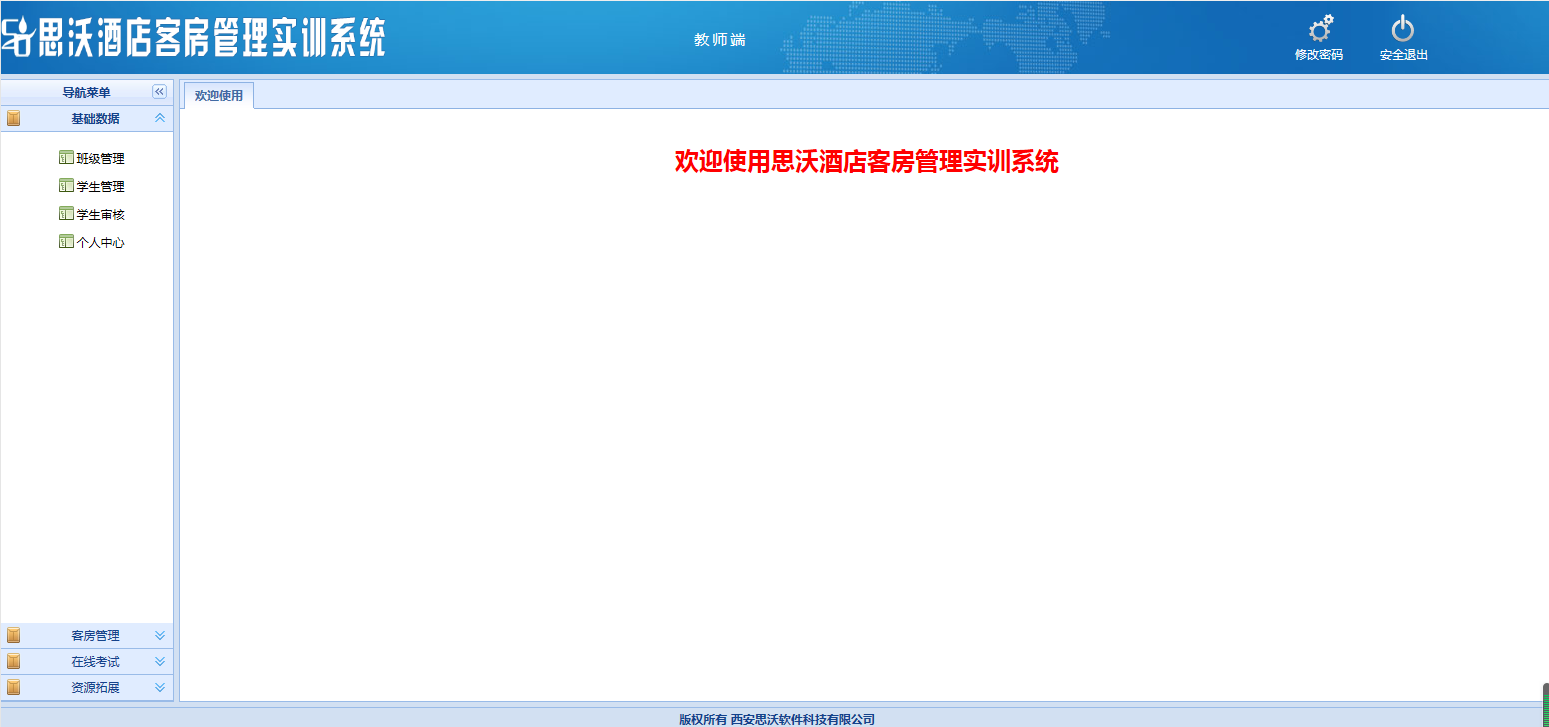 教師登陸界面(mian):基(ji)礎數(shu)據、客房管理,在線考(kao)試,資源拓展每個大模(mo)塊下分別(bie)有相應的(de)子模(mo)塊。